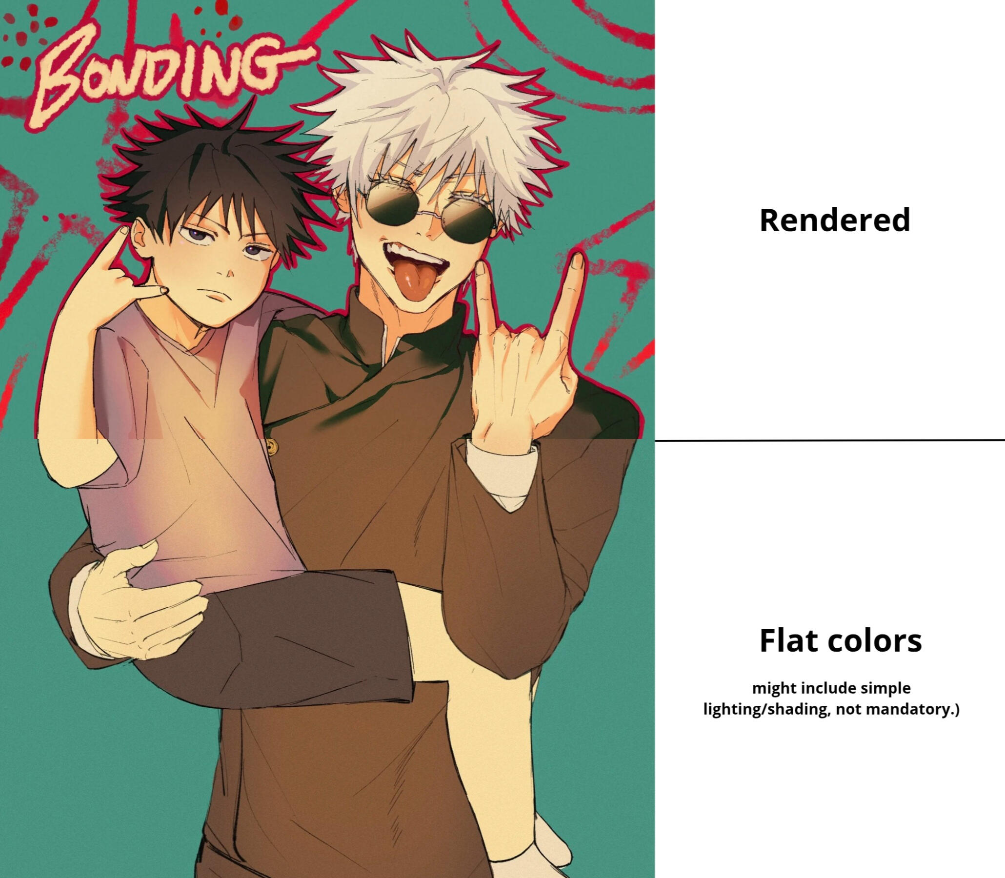 single characters only are for half the price.Backgrounds may vary in price depending on complexity, estimated value starts at USD 20. Simple flat color backgrounds have no extra charge.For artworks with more than two characters, additional fees apply per extra character (depending on format):